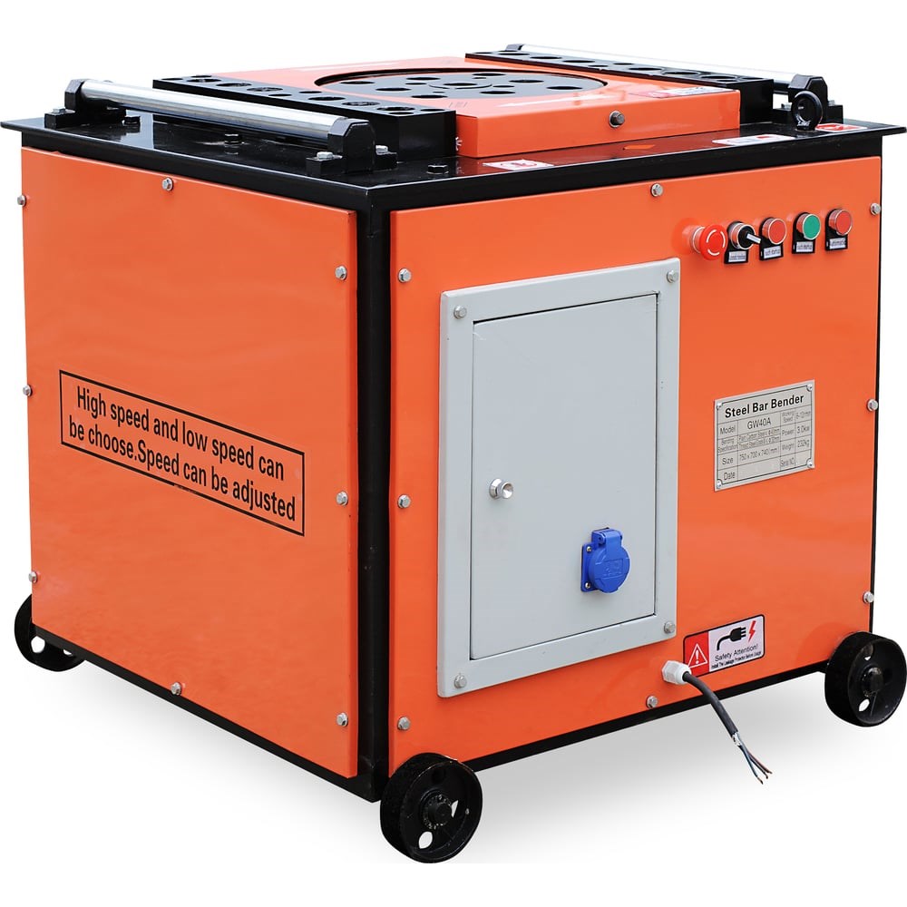 Станок для гибки арматуры TeaM GW-40A применяется на строительных площадках и при производстве ЖБИ в промышленных масштабах. Гибщик GW40А незаменимая вещь при создании фундаментов будущих зданий. Благодаря использованию данного станка удается существенно сократить время производства железобетонных изделий и конструкций, а также снизить трудозатраты. Все гибочные приспособления имеют высокую прочность, что обеспечивает длительный срок службы. Большое количество отверстий для установки втулок позволяет выбрать оптимальный угол и диаметр гиба. Наличие блока автоматики упрощает серийную работу. При необходимости можно одновременного сгибать несколько тонких прутков арматуры. Простое управление обеспечивает высокую эффективность работы. При разработке модели GW40A, конструкторы применили множество оригинальных технологических решений. Гибка производится вокруг оси вращения рабочего диска. Рабочий диск приводится во вращение посредством редуктора и электромотора. Гибка осуществляется как в ручном, так и автоматическом режиме. Требуемый радиус, форма и углы изгиба достигаются выбором определенных втулок.