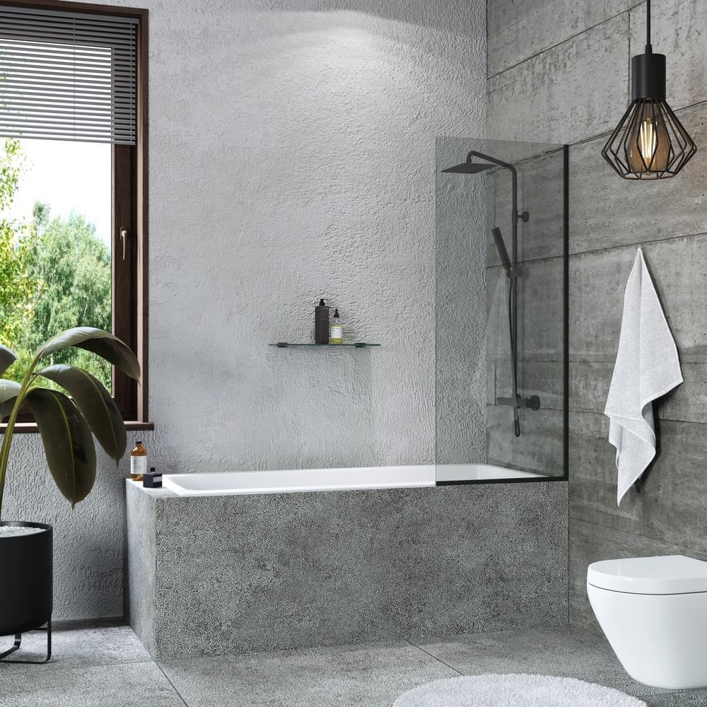 Стеклянная шторка для ванной комнаты с элегантным черным профилем. Подходит к классическим прямоугольным ваннам любого производителя и устанавливается на борт. Благодаря выдержанному дизайну, интерьер станет более строгим. В производстве данного изделия используются материалы только высокого качества. Витраж из безопасного, ударопрочного, закаленного стекла AGC Premium 8 мм, марки М-1, П-образный профиль из анодированного алюминия.
