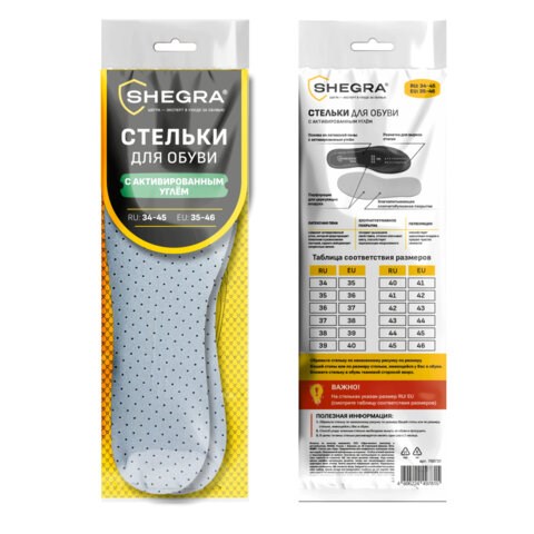 Стельки для обуви с российским размером RU 34-45, что соответствует европейскому размеру EU 35-46. На стельках указаны оба стандарта размера: RU и EU, а также нанесены линии выреза. Для удобства на упаковке приведена таблица соответствия размеров RU/EU. Стельки с активированным углём обеспечивают свежесть и комфорт, нейтрализуя неприятные запахи. Латексная пена снижает и поглощает ударные нагрузки при ходьбе, а хлопчатобумажное покрытие впитывает влагу и сохраняет ноги сухими. Перфорация способствует циркуляции воздуха и нормализации микроклимата у Вас в обуви. Обрежьте стельку по нанесенному размеру Вашей стопы или по размерам стельки, имеющейся у Вас в обуви. Вложите стельку тканевой стороной вверх. В целях гигиены рекомендуется менять стельки раз в два месяца.