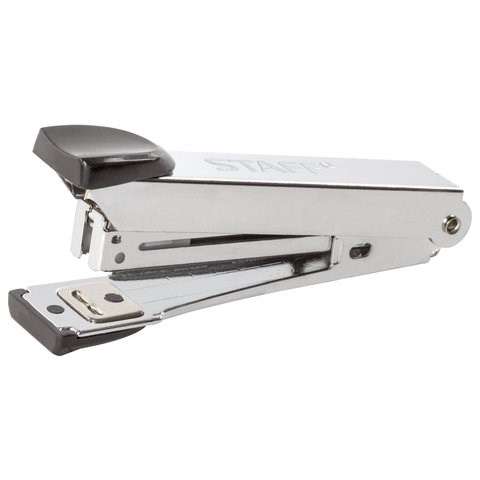 Степлер STAFF с антистеплером в черном металлическом корпусе с металлическим механизмом cпособен скрепить до 18 листов. Подходящий размер скоб № 10. Виды сшивания: закрытый, прямой. Глубина закладки бумаги - 53 мм. Габариты: высота - 43 мм, ширина - 20 мм, длина - 95 мм. Благодаря компактным размерам удобен в использовании и занимает мало места на рабочем столе, а классический дизайн делает степлер подходящим к любому интерьеру. Продается в картонной упаковке.