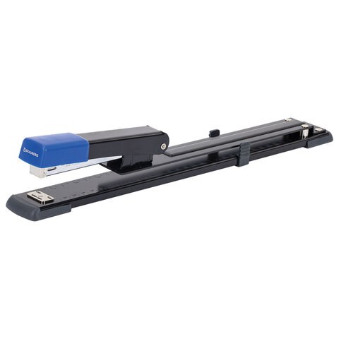 Металлический механизм позволяет сшивать открытым и закрытым способами документы объемом до 30 листов и регулировать глубину закладки бумаги до 30 см. Вмещает 150 скоб № 24/6. Регулятор расстояния сшивания имеет двойную градацию шкалы (сантиметр, дюйм). Корпус выполнен из металла и пластика.