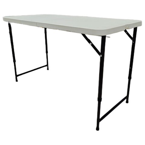 Модель складного стола FT-004 отличается прочным стальным каркасом с возможностью регулировки стола по высоте, износостойкой столешницей из HDPE пластика и выдерживает распределённую нагрузку до 150 кг, оставаясь устойчивой и безопасной при ежедневном использовании.