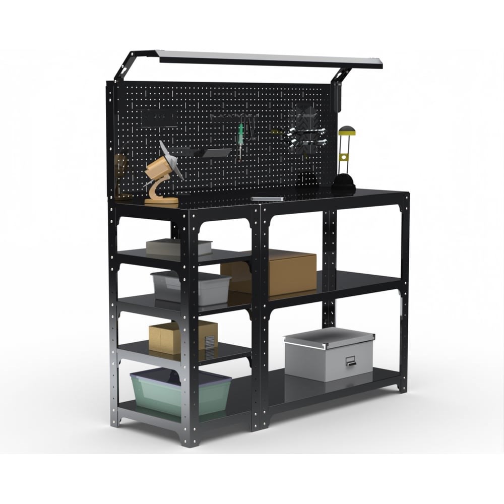 Стол-верстак ООО Металекс KIT 950х1700х600 мм, с боковыми полками, перфопанелью и комплетом освещения, черный