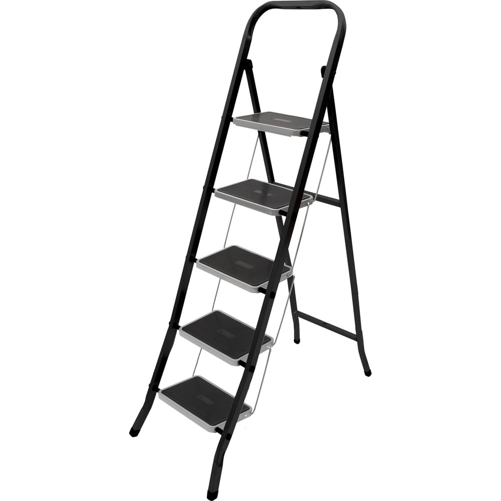 Стальная 5-ти ступенчатая стремянка для бытовых, ремонтных, строительно-монтажных, отделочных и садово-дачных работ серии "Jet Black". Стремянка имеет порошково-полимерное покрытие-защита от коррозии. Ступени с противоскользящими ковриками, что обеспечивает дополнительную безопасность при работе со стремянкой. Конструкцией предусмотрены страховочные ремни безопасности. Размер ступеней - 30х20 см.