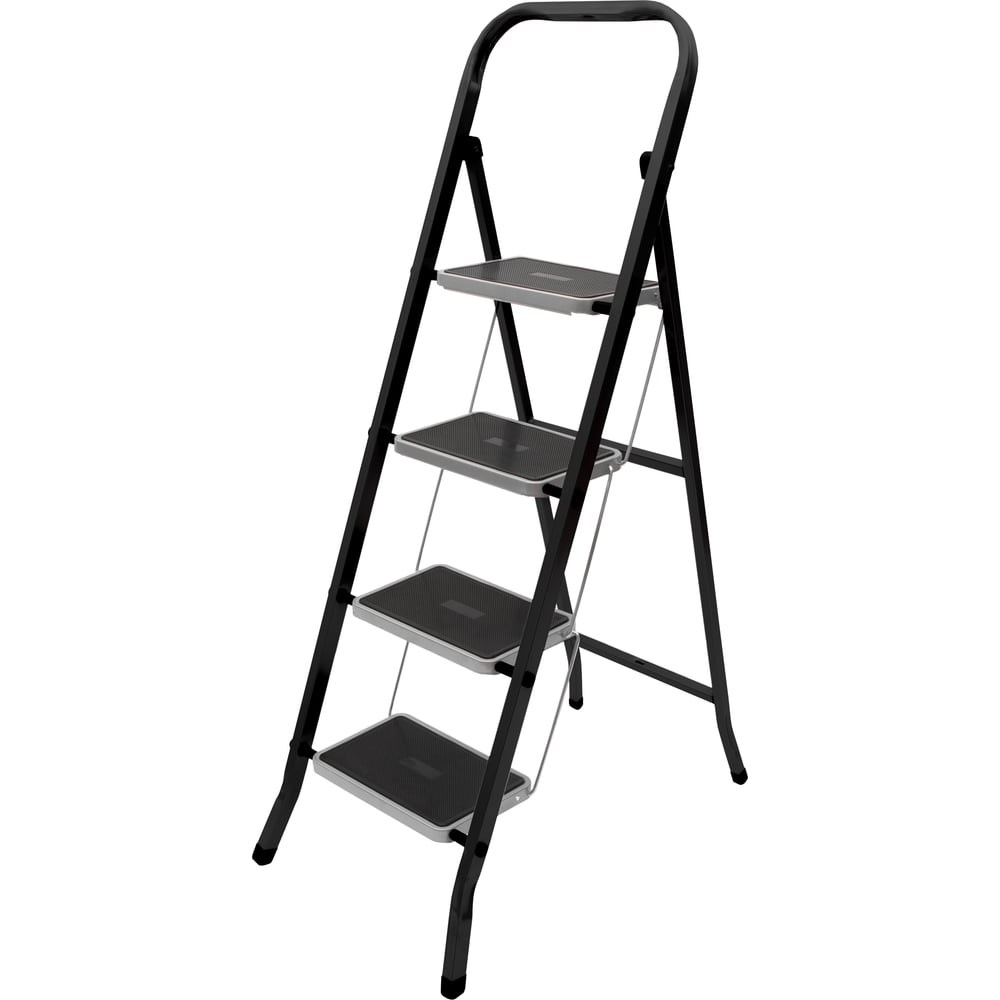 Стальная 4-х ступенчатая стремянка для бытовых, ремонтных, строительно-монтажных, отделочных и садово-дачных работ серии "Jet Black". Стремянка имеет порошково-полимерное покрытие-защита от коррозии. Ступени с противоскользящими ковриками, что обеспечивает дополнительную безопасность при работе со стремянкой. Размер ступеней - 30х20 см.
