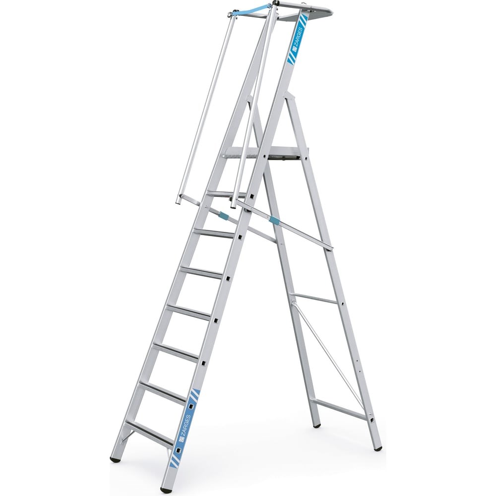 Стремянка с большой площадкой Zarges ZAP Safemaster S 8 ступеней 41678 Безопасность при подъёме и спуске благодаря противоскользящим ступеням и поручню, устойчивость при работе, компактные размеры в сложенном состоянии. Большая рабочая площадка (400×400 мм); Перила с 3 сторон для безопасности при работе; Большой лоток для инструментов; Оптимальная устойчивость благодаря жестким стяжкам с обеих сторон; Ступени Safer Step глубиной 80 мм; Компактные размеры в сложенном состоянии благодаря автоматически сворачивающимся перилам ограждения; Ступени и стойки из прессованного алюминиевого профиля; Совместимость с консолями ZAP; Сменные противоскользящие башмаки из двухкомпонентного пластика; Дополнительные комплектующие: поворотные консоли ZAP для повышения устойчивости по правилам BGI 637.