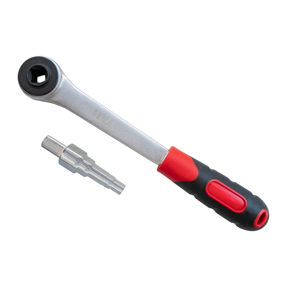Ступенчатый ключ предназначен для монтажа радиаторных ниппелей и коротких крановых удлинителей. Разностороннее применение, для внутренних шестигранных, двенадцатигранных, кулачковых гнезд, размер 3/8'' - 1/2'' - 3/4'' - 1'' и другие промежуточные размеры. Специальная конструкция ступенчатого ключа без перекашивания ниппелей и резьбовых соединений. Трещотка 1/2'', переставляется, быстрый и легкий монтаж. Изготовлен из хромованадиевой стали, закаленный, никелированный