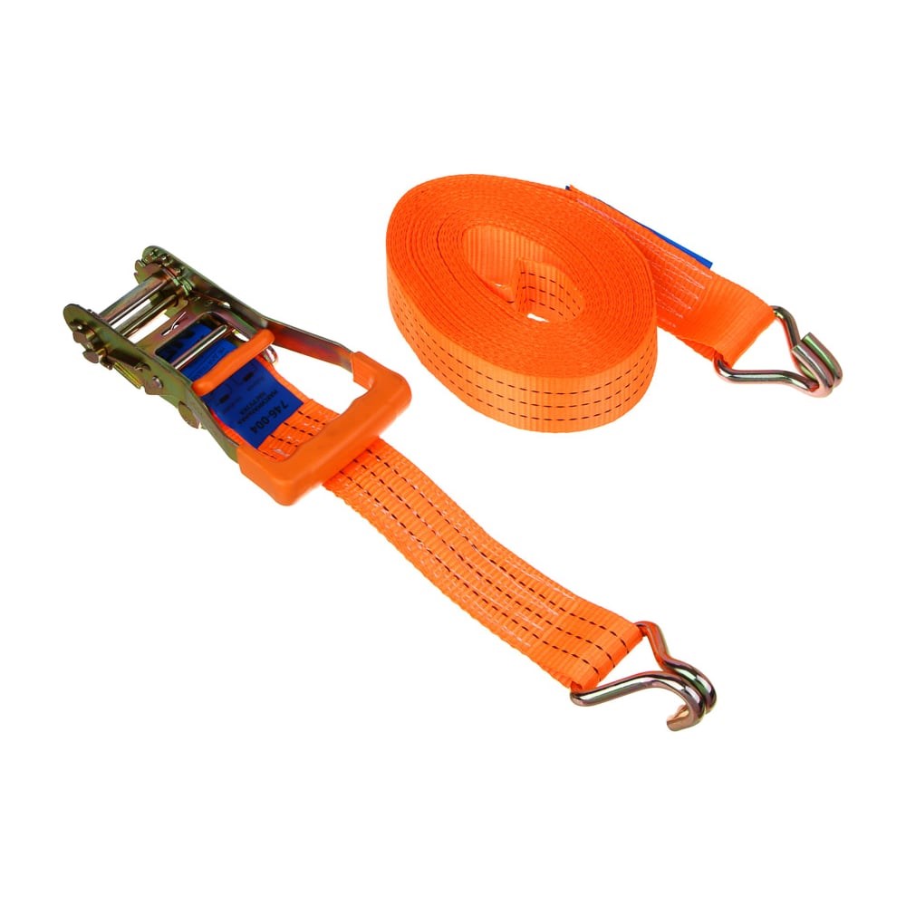 Ремень крепежный от бренда NEW GALAXY для стяжки и крепления груза с храповым механизмом российского производителя предназначен для быстрого и надежного крепления различных грузов, перевозимых на всех видах транспорта. Используется для перевозки и транспортировки багажа. Для удобства крепежа стяжка оснащена двойным крюком. Усиленный механизм натяжения с фиксатором (храповик) предотвращает ослабление ленты. Максимальная стяжная нагрузка данного ремня для крепления груза – 3000 кг, максимальное усилие удержания – 6000 кг. Длина 12 м. Устойчив к истиранию, не выгорает на солнце.