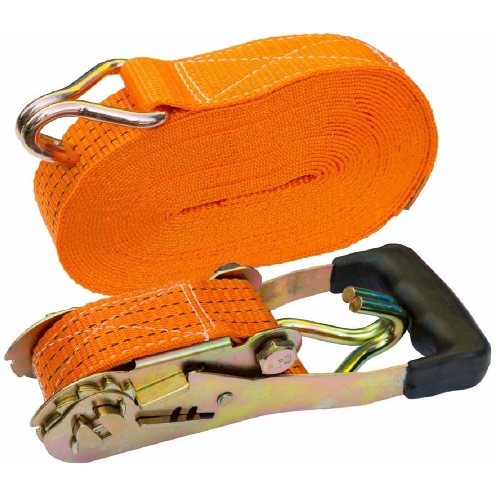 Стяжка крепления груза ДАЛИ-авто 2,5-5 тонн 15028 обеспечивает надежную фиксацию груза, препятствует его смещению и повреждению. Храповый механизм с рычажным приводом позволяет легко и быстро отрегулировать длину ремня. Лента изготовлена из полимерных материалов (капрон, нейлон и полиэстер), которые отличаются морозостойкостью и влагостойкостью. Крюки выполнены из анодированного металла, что гарантирует устойчивость к коррозии.