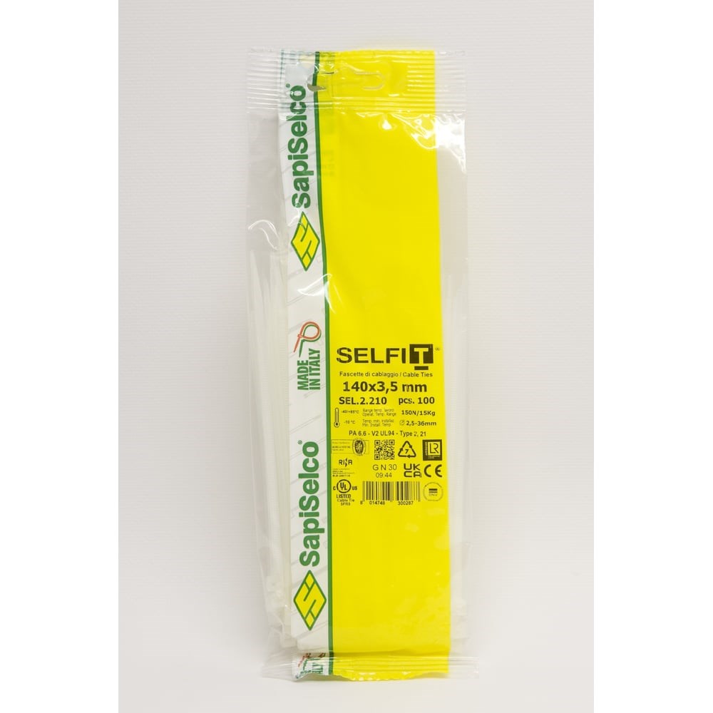 Стандартные кабельные стяжки SapiSelco "Selfit" изготавливаются из самозатухающего полиамида 6.6 (UL94: V2).Они состоят из гладкой ленты с одной стороны, ребристой с другой, и квадратной головки с полиамидным стягивающим зубом.Продукт поставляется в широком диапазоне размеров для удовлетворения любых потребностей. По европейским стандартам указывается СРЕДНЯЯ нагрузка на разрыв, для данной модели- 150 N / 15 кг. То есть максимальная нагрузка будет значительно больше указанной.