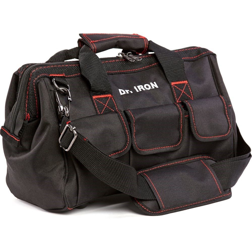 Сумка для инструмента с ремнем Dr.IRON 320x180x220 мм DR1020 подходит для переноски инструментов или принадлежностей, вес которых не превышает 15 кг.Имеет 7 карманов: 3 в передней части и 4 внутри.Сумка выполнена из полиэстера 600D Oxford с ПВХ пропиткой. Обладает износоустойчивостью и водоотталкивающими свойствами, не содержит токсичных веществ в материале.В лицевой части вставлен металлический каркас, который позволяет изделию держать форму в раскрытом состоянии.Дно укреплено пластиковой вставкой толщиной 2 мм, а также мягким полиропиленовым слоем.Благодаря регулируемому ремню с мягкой накладкой сумку можно носить на плече.