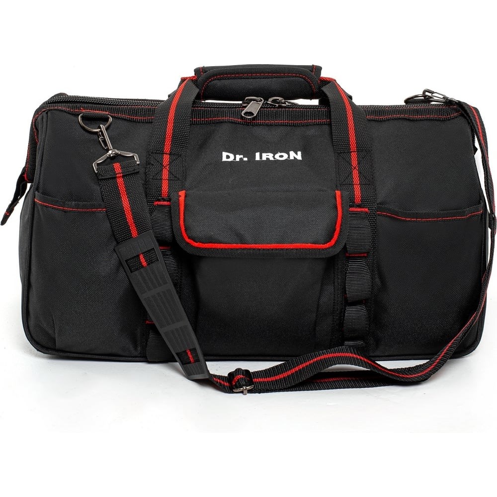 Сумка для инструмента с ремнем Dr. IRON 445x205x275 мм DR1034 выполнена из экологически чистого безопасного материала. Сумка не содержит токсичных веществ: фенолов, формальдегидов, тяжелых металлов. Материал сумки: с внешней стороны - полиэстер Oxford 600D с ПВХ пропиткой, с внутренней – подкладка из полиэстра. Крупная молния имеет 2 замка. В лицевой части сумки вставлен металлический каркас, который позволяет сумке держать форму в раскрытом состоянии. Сумка оснащена 14 карманами: 6 внешних и 8 внутренних. Центральный внешний карман имеет закрывающийся клапан на липучке. На ручках сумки предусмотрена мягкая накладка на «липучке» для комфортного ношения сумки в руках. Сумка укомплектована регулируемым ремнем. Швы прошиты прочными капроновыми нитями, в местах наибольшей нагрузки швы усилены. Рекомендованная нагрузка до 12 кг. Объем 20 литров. Гарантия 5 лет.
