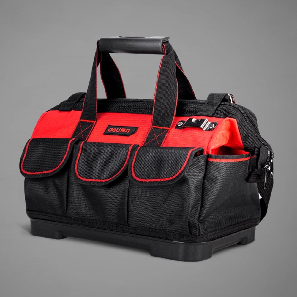 Сумка для инструментов с жестким пластиковым дном используется для хранения и переноски инструмента. Сумка выполнена из качественной и прочной ткани Oxford плотностью 1680D, благодаря чему сумка устойчива к истиранию и повреждению острыми предметами.Благодаря используемому материалу EVA сумка получила влагоотталкивающее свойство и высокую прочность.Вместимость - 16 кармашков (!!!) и объёмное основное отделение.Сумка армирована стальными стержнями, что добавляет ей жёсткости и устойчивости, выдерживает нагрузку до 20 кг.Пластиковое дно с ножками защитит сумку от механических воздействий агрессивной окружающей среды, такие как грязь, различные жидкости, строительный мусор и пр.Оснащена металлической скобой для подвеса измерительной рулетки.Прочная и удобная пластиковая ручка обеспечивают комфортную переноску.Поставляется в комплекте с регулируемым плечевым ремнем.