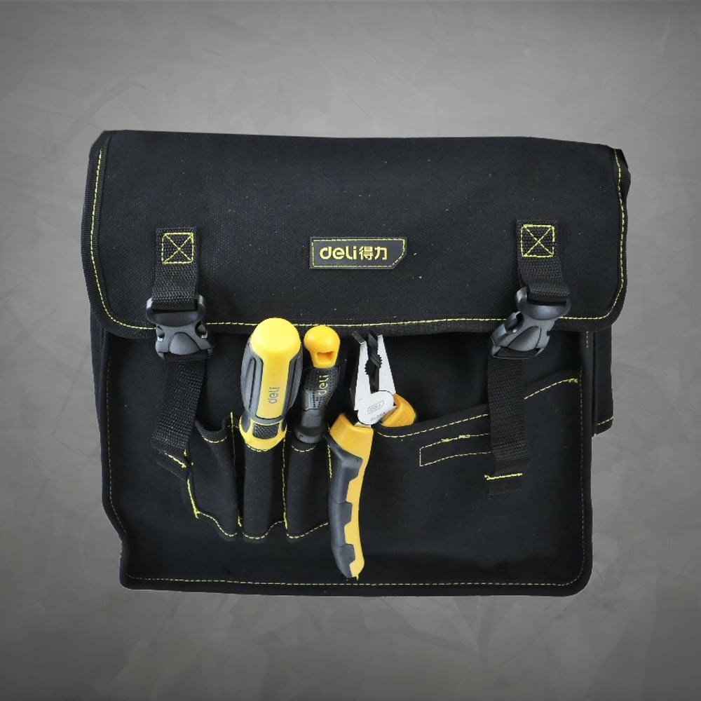 Сумка-планшет для инструментов Deli DL-P6 изготовлена из прочной ткани канвас, обладающей высокой износостойкостью и долговечностью. Канвас полунатуральный материал, внешне напоминающий холст. Представляет собой доработанную версию парусины. Он почти не пропускает воду, легко стирается от пятен, мягкий на ощупь и долго сохраняет первозданный вид. Сумка оснащена основным объемным отделением, которое позволяет удобно разместить различные инструменты и принадлежности, закрывающееся защёлками фастекс, предотвращающие выпадение инструментов при движении или транспортировке сумки. Так же внутри сумки находится большой внутренний карман, предназначенный для хранения более мелких предметов или документов. На боковых сторонах сумки расположены два узких кармана, предназначенные для хранения узких инструментов, таких как отвертки, ручки ножей и прочих мелких предметов. Это удобно, так как позволяет сохранить порядок внутри сумки и легко найти нужный инструмент при работе. На лицевой стороне сумки находятся три петли, которые предоставляют возможность закрепить дополнительное оборудование, такое как ручки, отвертки или зажимы. Это позволяет иметь эти инструменты всегда под рукой и упорядочить рабочую зону. Для комфортной переноски сумки предусмотрен регулируемый плечевой ремень. Отлично подойдёт для электриков, сантехников, плотников, столяров, замерщиков и других.