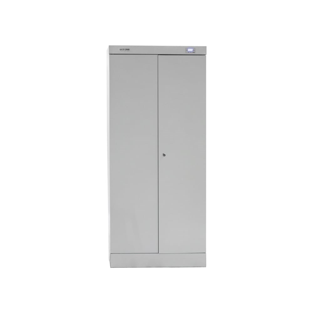 Сушильный шкаф для одежды ШСО 2000 ШСО-2000 предназначен для сушки мокрой одежды и обуви, предварительный отжим не требуется. Состоит из двух базовых элементов: верхней части корпуса шкафа и нижней подставки с встроенным блоком нагрева. Верхняя часть корпуса соединяется с подставкой с помощью стандартных метизов. Верхняя часть корпуса закрывается двумя дверьми, в одной из которых установлен почтовый замок, запирающий одновременно обе двери. Внутри верхняя часть корпуса снабжена шестью съемными сетчатыми полками. На полки можно укладывать для сушки рукавицы, головные уборы или обувь. К сетчатым полкам можно так же подвешивать плечики с одеждой. Нижняя подставка шкафа представляет собой сварную конструкцию из листовой стали и являющейся базовым элементом, на котором собирается шкаф. Внутри корпуса подставки встроен блок нагрева. Блок нагрева состоит из: тангенциального вентилятора, игольчатого слюдяного нагревателя, датчика контроля температуры и электронного блока управления. Кнопки управления и световая индикация режимов работы расположены на лицевой стороне крышки шкафа. В качестве защиты от перегрева используется термоплавкий предохранитель (без возврата в исходное положение). В крышке шкафа расположено отверстие для выхода воздуха. В комплекте фланец для подключения к внешней системе вентиляции.