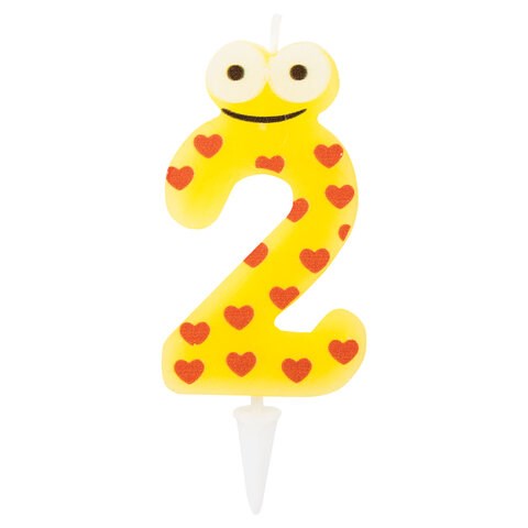 Свеча желтого цвета с принтом в виде глазок представляет собой цифру "2". Свеча-цифра выполнена из парафина и укомплектована пластиковым держателем для удобства размещения цифры в торте или другом кондитерском изделии. Высота - 6 см, ширина - 3,3 см, толщина - 1 см.