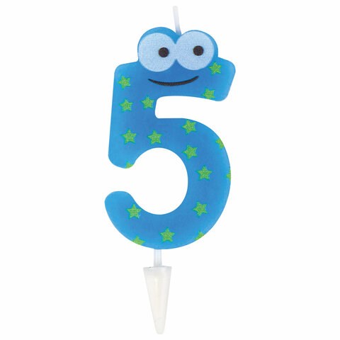 Свеча голубого цвета с принтом в виде глазок представляет собой цифру "5". Свеча-цифра выполнена из парафина и укомплектована пластиковым держателем для удобства размещения цифры в торте или другом кондитерском изделии. Высота - 6 см, ширина - 3,3 см, толщина - 1 см.