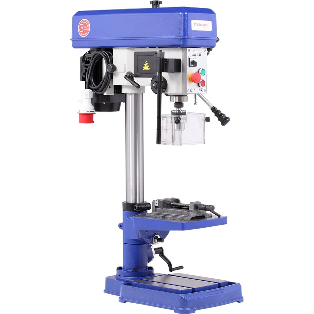 Сверлильно-резьбонарезной вертикальный станок предназначен для обработки различных материалов (мягкие и твердые металлы, древесина) вращающимся режущим или шлифующим инструментом, с целью получения сквозных и глухих отверстий, нарезания резьбы, для чистовой обработки, расточки отверстий, образованных в заготовке каким-либо другим способом. Питание станка осуществляется от трехфазной сети переменного тока напряжением 400 В. Электродвигатель асинхронный, мощность 750 Вт, режим работы S1. Модель имеет настольную установку. Основание, рабочий стол и корпус сверлильной головки изготовлены из чугуна. Станок способен сверлить отверстия с максимальным диаметром до 18 мм (в твердых металлах) и до 50 мм (в древесине). Максимальный диаметр нарезания резьбы - М12. Патрон ключевой трехкулачковый, с возможностью установки инструмента с хвостовиком до 16 мм. Вращающий момент с вала двигателя на шпиндель передается с помощью поликлиновой передачи. Скоростей у данной модели пять, от 200 до 2350 об./мин. Изменить частоту вращения можно переброской ремня на нужную ступень шкивов. Рабочий стол имеет размер 283×248 мм, возможность наклона от - 45 до +45 градусов, регулировку по высоте и два паза под установку тисков (входят в комплект поставки) или других зажимов. Основание станка - это не только надежная опора, но и рабочая поверхность 345×520 мм, а пазы позволят надежно закрепить заготовку. Максимальное расстояние между шпинделем и основанием составляет 530 мм.