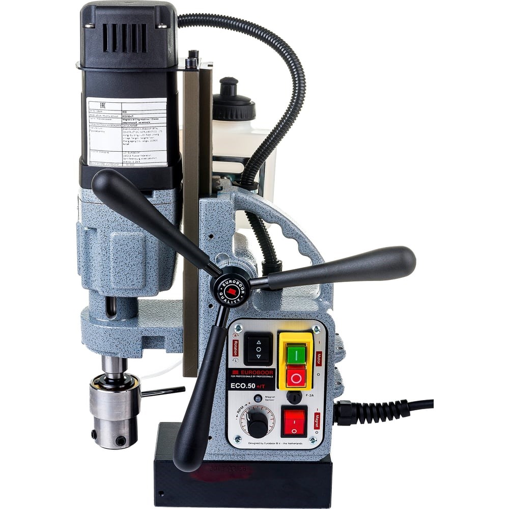 Сверлильный станок на магнитном основании EUROBOOR ECO.50+/T используется для сверления отверстий, зенковки и нарезания резьбы. Модель оснащается двухскоростной коробкой передач с возможностью регулировки оборотов в диапазонах 100-280 об/мин и 185-530 об/мин. В качестве оснастки используются как кольцевые фрезы диаметром от 12 мм до 50 мм, так и спиральные сверла диаметром от 1 мм до 23 мм. Станок позволяет производить зенкование в диапазоне 10-55 мм. Точная электронная настройка скоростного режима и переключение направления вращения позволяют применять оборудование для нарезания резьбы от М3 до М20. Мощность двигателя составляет 1250 Вт, общая мощность модели равняется 1375 Вт. Для безопасной эксплуатации оборудование оснащается гироскопическим датчиком, который отключает двигатель в случае случайного смещения станка.