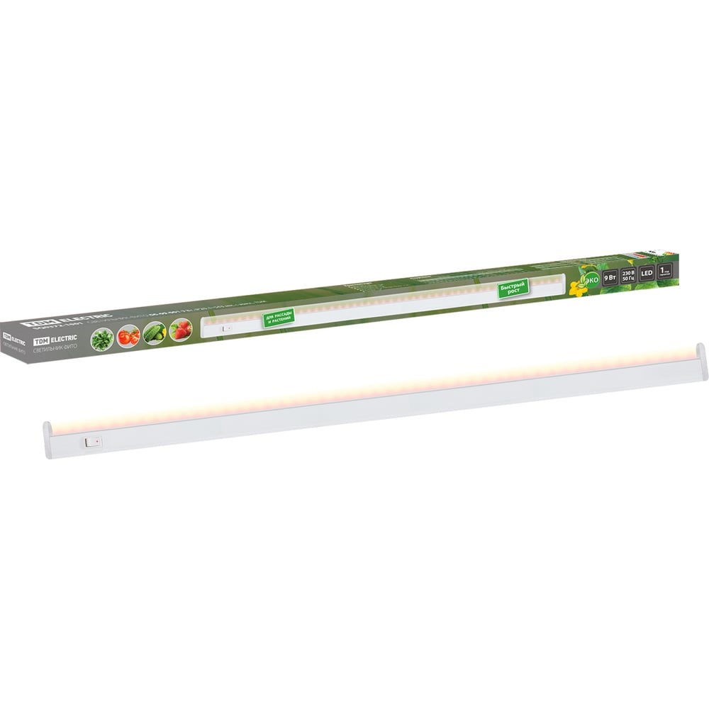 Светильник "ФИТО" 9 Вт, IP20, l=543 мм, с выкл., TDM Electric предназначен для дополнительного освещения растений в условиях недостаточности или полного отсутствия естественного освещения. Он подходит для всех видов растений и обеспечивает фотосинтетический поток в 14,4 мкмоль/с.Светильник имеет комфортное для глаз розоватое свечение и оптимальную высоту над растениями – 0,2-0,5 м. Он оснащен выключателем на корпусе и имеет низкое тепловое излучение, которое не влияет на микроклимат в помещении.Конструкция светильника обеспечивает защиту от проникновения пыли и влаги, степень защиты IP20. В комплект поставки входят светильник, монтажный комплект, сетевой шнур и коннектор.Светильник ФИТО 06-09-001 имеет два режима работы: «дополнительная синяя досветка» и «основной полноспектральный». Он может быть размещен в непосредственной близости от растений, так как светодиоды не являются источником инфракрасного и ультрафиолетового излучения.Светильник выполнен из анодированного алюминия и пластика, имеет размеры l=543 мм и цвет белый. Светильник ФИТО 06-09-001 обеспечивает качественное отведение тепла и правильный выбор режима работы светодиодов, что гарантирует высокую надежность и долгий срок службы – до 20 000 часов. Он не требует специальной утилизации и может быть использован ежедневно по 8–12 часов.