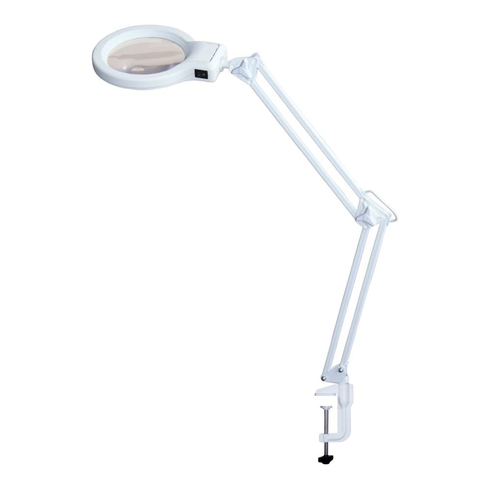 Светодиодный светильник с лупой Леда С20-035 белого цвета на металлической струбцине. Материал лизы - пластик (полиметилметакрилат (ПММА)). Линза имеет две зоны увеличения: основное увеличение 2 диоптрии (диаметр 122 мм) и дополнительное увеличение 9 диоптрий (диаметр 24,5 мм). Выключатель клавишный на плафоне. Применение: рукоделие, косметология, ювелирные, радиомонтажные мастерские, работа с мелкими деталями.
