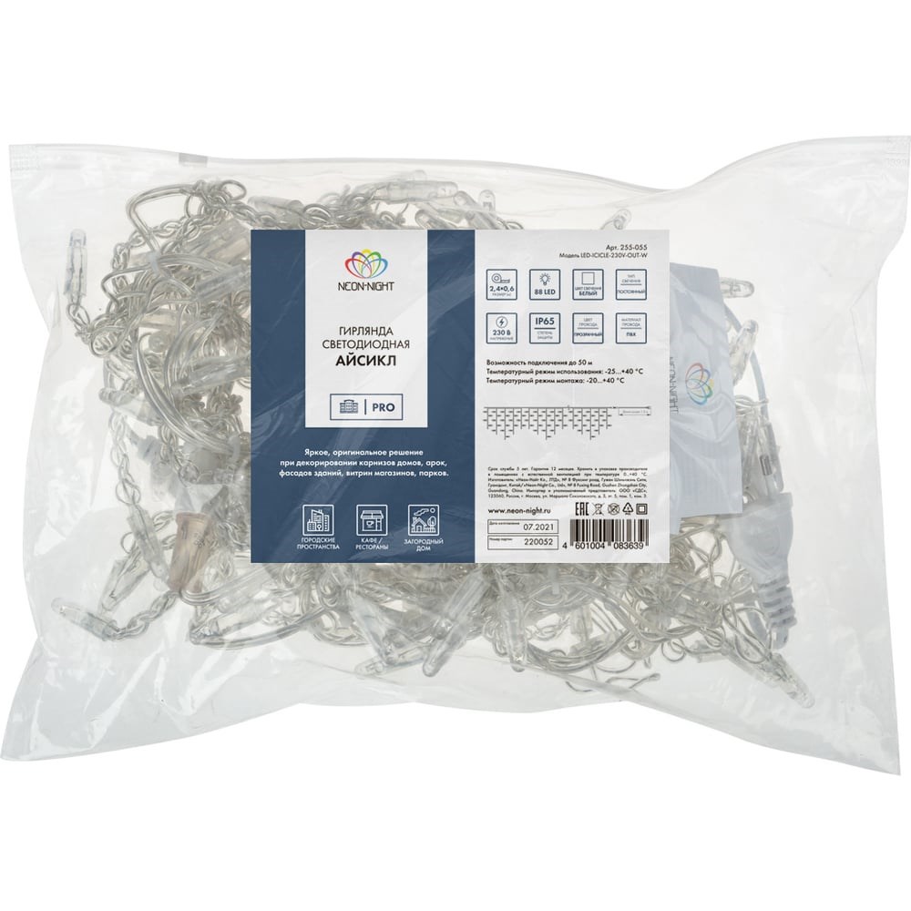Гирлянда Айсикл (Бахрома) представляет собой гибкий горизонтальный шнур-шину, к которому через определенные промежутки крепятся вертикальные нити разной длины со светодиодами. Гирлянда имитирует сосульки и может послужить оригинальным решением при украшении карнизов, арок, фасадов зданий, витрин магазинов, а также стать эффектным элементом декора внутри помещений.Благодаря использованию светодиодов отличительной особенностью гирлянды является превосходная яркость и низкое энергопотребление.При длине 2,4 м гибкая направляющая имеет 24 вертикальные нити от 20 до 60 см. Гирлянда имеет белый цвет свечения и предназначена для использования как внутри помещений, так и снаружи.