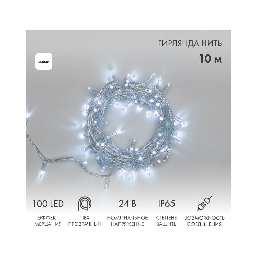 Гирлянда Нить представляет собой провод с последовательно расположенными коротенькими отводами, направленными в разные стороны. На концах этих отводов расположены яркие светодиоды.Благодаря своей универсальной конструкции гирлянда особенно подходит для украшения как уличных, так и домашних елей, а также для оформления витрин, окон, колонн, элементов интерьера и различных композиций. Наличие мерцающих светодиодов белого цвета привлекает внимание и значительно преображает украшенную поверхность (мерцает каждый 5-й светодиод).Для подключения необходим трансформатор код товара 23808315 (артикул поставщика 531-100) или код товара 23808327 (артикул поставщика 531-200).