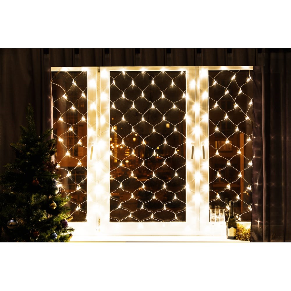 Гирлянда "Сеть" представляет из себя черное полотно, разбитое на равные ромбы, в углах которых находятся светодиоды. Данная гирлянда имеет размер 1*1,5 метра и теплый белый цвет свечения 160 светодиодов.При использовании на окнах или других поверхностях гирлянда позволяет осуществить равномерную засветку по всей площади, для этого достаточно ее растянуть по периметру, используя, например, присоски с крючком.В комплекте идет шнур питания. Для динамического свечения необходимо приобрести контроллер 217-203 или 217-204.