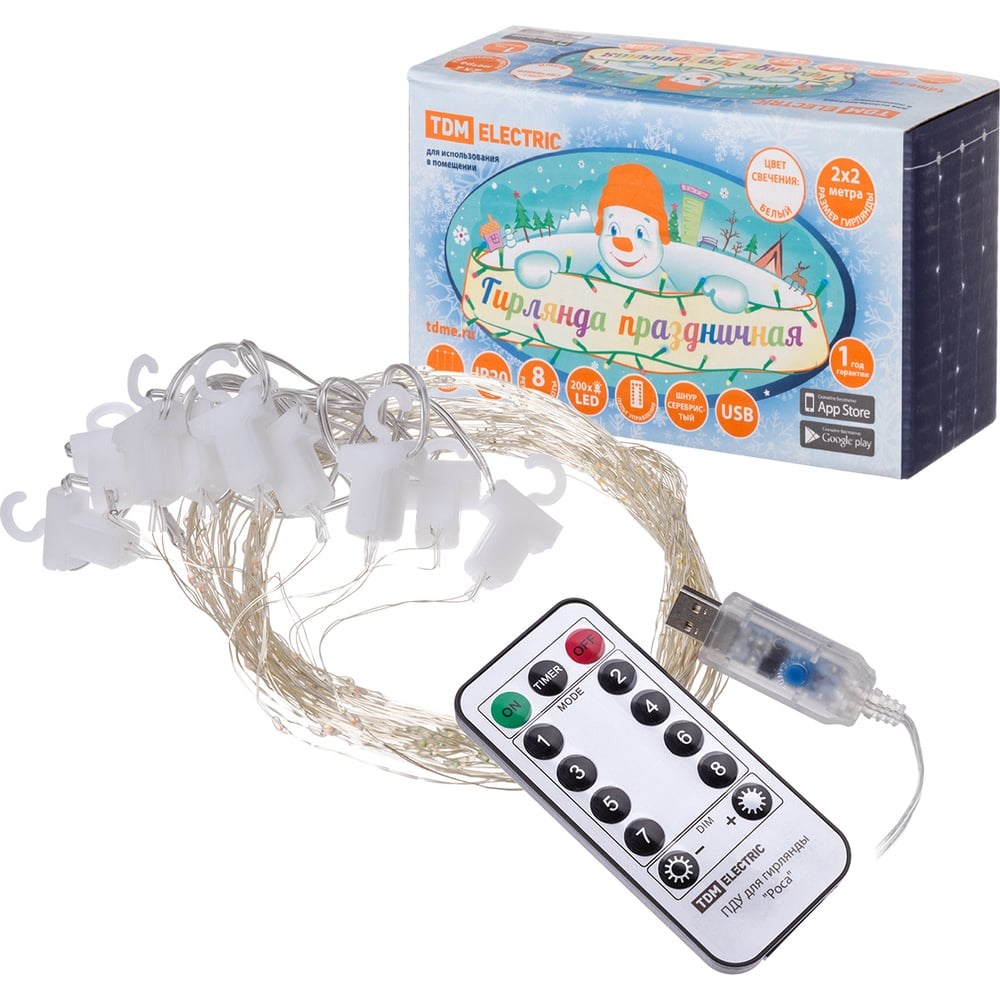 Светодиодная гирлянда TDM ELECTRIC Роса - занавес, 2х2 м, 200LED, белый, ПДУ, USB, IP20 SQ0361-0087