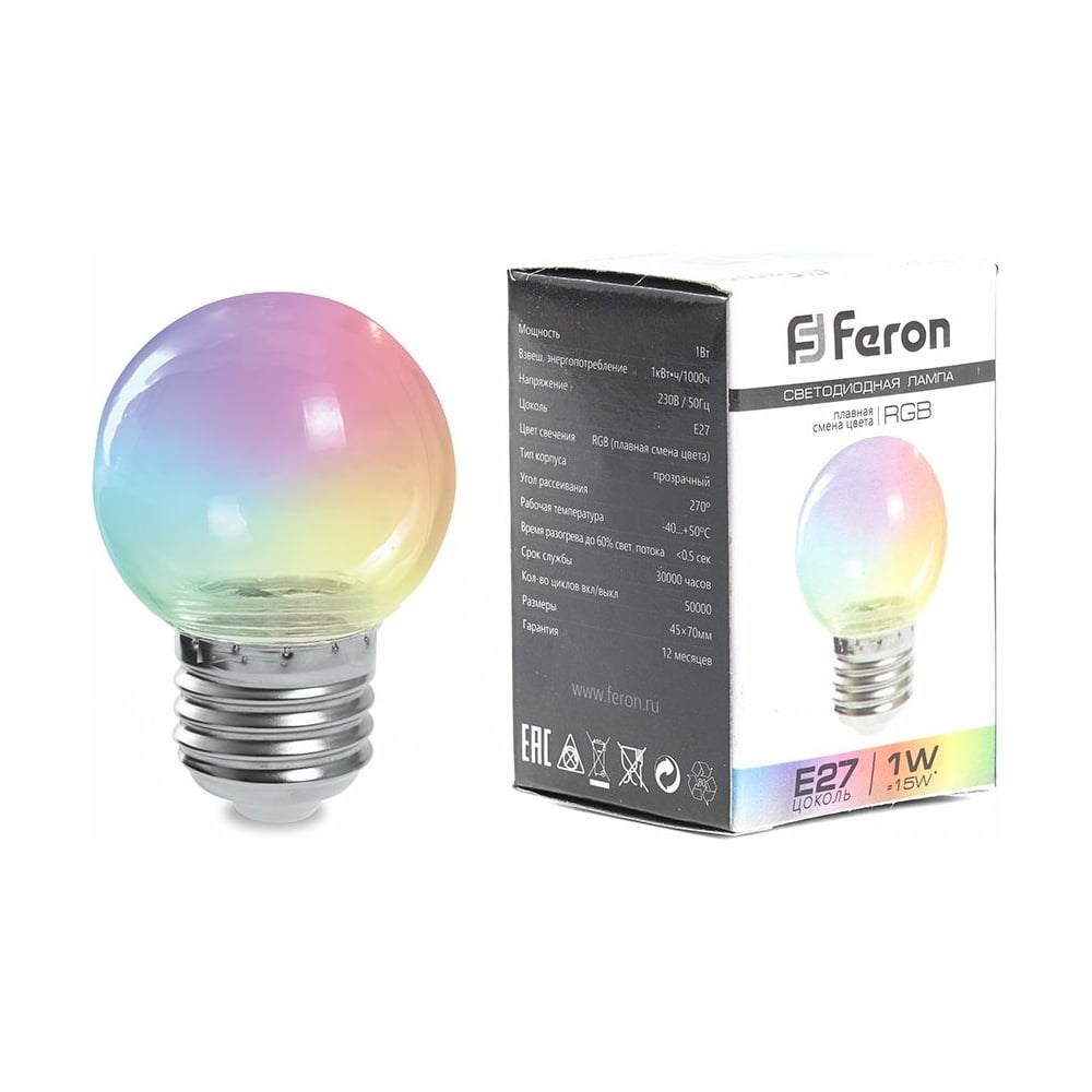 Светодиодная лампа FERON LB-371, G60 шар, 3W 230V E27 RGB, угол рассеивания 220 38133
