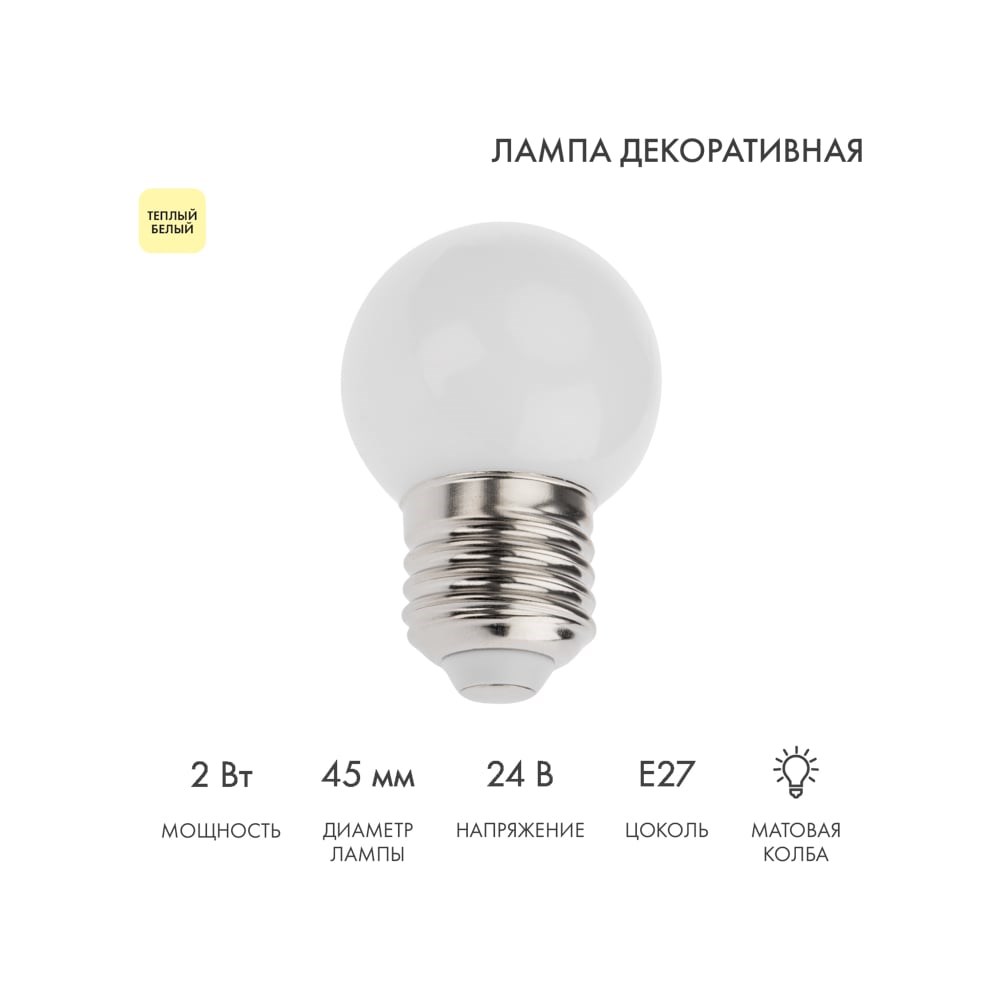 Декоративная светодиодная лампа используется с гирляндой Белт-Лайт, которая служит для украшения улиц, фасадов зданий и внутреннего интерьера. Колба лампы имеет форму шара диаметром 45 мм, что позволяет увеличить площадь свечения и насыщенность светом окружающего пространства. Изделие выполнено из ударопрочного поликарбоната, обладающего высокой устойчивостью к механическим повреждениям. Лампа совместима с двухжильными или пятижильными гирляндами Белт-Лайт. При использовании специального контроллера можно создать различные динамические световые эффекты. Полная мощность для расчета нагрузки и для подбора контроллеров составляет 2 ВА.