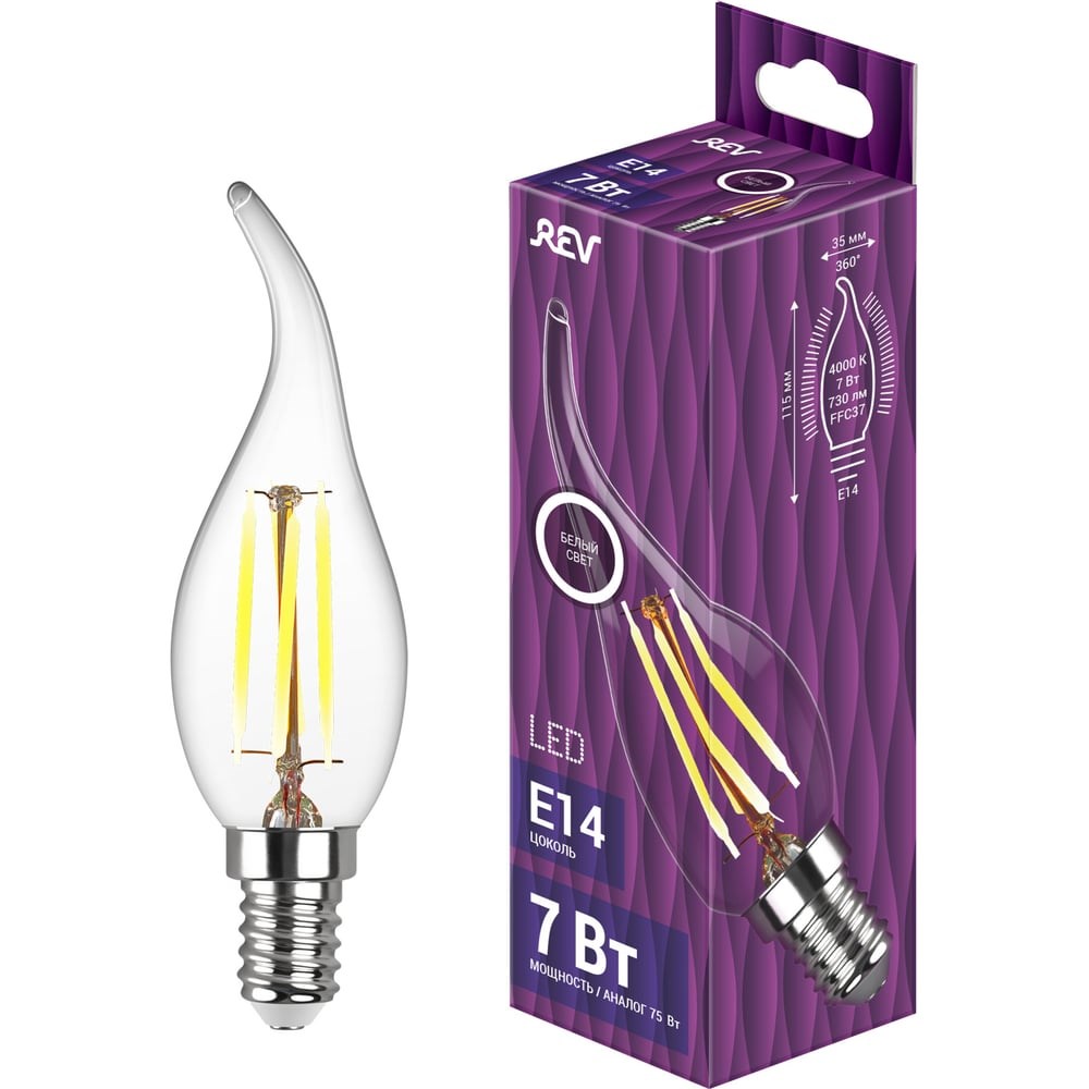 Филаментные светодиодные лампы сочетают в себе привычный внешний вид ламп накаливания и преимущества энергосберегающих светодиодных вариантов, обеспечивают значительную экономию электроэнергии и имеют более высокий КПД. Специальная стеклянная колба позволяет использовать их в открытых светильниках, хрустальных люстрах, торшерах и бра. Идеально подходят для различных стилей: лофт, авангард, ретро и др. Филаментные лампы REV выпускаются в различных формах: изящные свечи (витые, гладкие, изогнутые), шары Ø от 45 до 125 мм, груши, колбы Эдисона, с RGB нитью, а также лампы специальной декоративной серии в виде кристаллов и бриллиантов - на любой вкус и для самых оригинальных дизайнерских решений. В линейке представлены лампы мощностью от 2 до 13W в трех вариантах: теплого в 2700К или 2200К и нейтрального белого свечения в 4000К. Такие LED лампы обладают высокой стабильностью светового потока, отсутствие пульсации создает мягкое, комфортное и безопасное для глаз свечение, особая конструкция обеспечивает широкий угол рассеивания света до 360°.