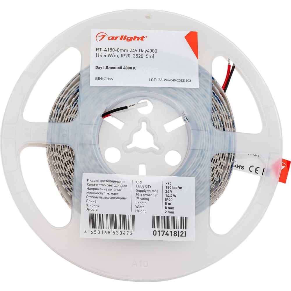Светодиодная лента RT-A180, открытая . Светодиоды 3528, 180 шт/м (900 шт на 5 м), белая плата, ширина 8 мм, скотч 3M. Цвет ДНЕВНОЙ 4000 K, цветопередача CRI>90 , угол 120°. Питание 24V, мощность 14.4 Вт/м (72 Вт на 5 м). Размеры 5000x8x2 мм. Мин.отрезок 33.33 мм, 6 светодиодов. Цена за 1 м. Обязательная установка на профиль.