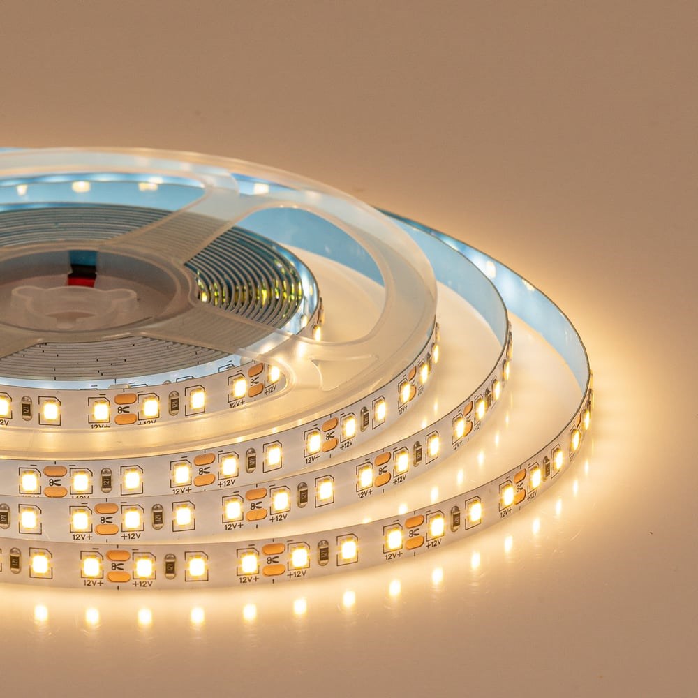 Светодиодная лента Donled 5м, 12В, IP20, 120 LED/m, 9.6Вт/м, теплый белый, 8мм, DL-R120-2835-WW предназначена для декоративной подсветки интерьеров, потолочных ниш, рабочих зон кухни, мебели, торгового оборудования. Используется для рекламных конструкций и витрин. Обязательна установка на профиль (для теплоотвода и продления срока службы). Цветопередача CRI>80. Питание 12 В, мощность 9.6 Вт/м (48 Вт на 5 м). Размеры 5000x8x1.2 мм. Мин. отрезок 25 мм. Возможно управление с помощью диммера для одноцветных лент. Подключение изделия осуществляется при помощи специального блока питания (драйвера), который преобразовывает переменное напряжение 220В в 12В. Во избежание выхода из строя не допускается длительная работа ленты в смотанном виде!