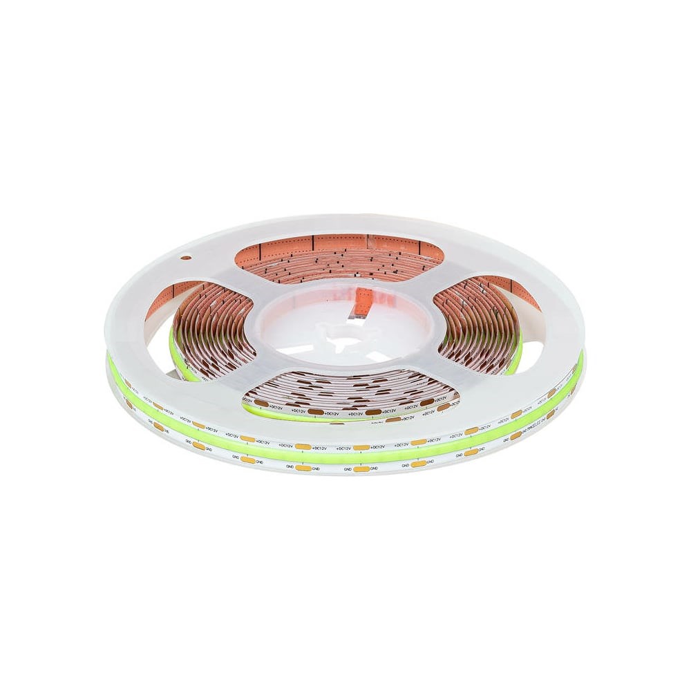 Светодиодная лента 12В COB 12В, 504д/м, 12Вт/м, IP20, 618лм/м, зеленый ML-R504-COB-G-S предназначена для уникального светового дизайна интерьеров, эффектной подсветки торгового оборудования и для оформления самых разных конструкций. Лента светится яркой и равномерной линией без применения рассеивателей (экранов). Новая технология COB (Chip-On-Board) позволила повысить светоотдачу LED-ленты и одновременно получить сплошное свечение, без световых точек и прерывистости. Результат достигнут нанесением большого количества мелких чипов на единую основу. В COB-ленте 504 светодиода на метр. Слой люминофора сверху, помимо своей преобразующей функции, защищает детали платы от внешнего воздействия. Размеры 5000х10x1.6 мм. Минимальный отрезок - 17.7 мм. Возможно управление с помощью диммера для одноцветных лент. Подключение изделия осуществляется при помощи специального блока питания (драйвера), который преобразовывает переменное напряжение 220В в 12В. Обязательна установка на профиль (для теплоотвода и продления срока службы).