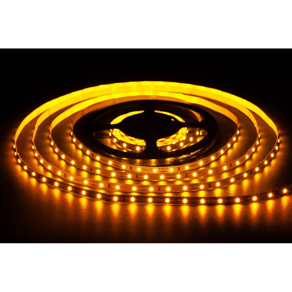 Светодиодная лента MAKSILED, открытая для организации декоративной подсветки в помещениях: подсветка лестниц, ступеней, плинтусов, мебели, ниш, натяжных потолков, торгового оборудования и рекламных конструкций. Возможно управление с помощью диммера для одноцветных лент. Светодиоды SMD 2835 желтого цвета свечения, 60 шт/м (300 шт на 5 м), ширина 8 мм, скотч TESA. Мощность 4.8 Вт/м (24 Вт на 5 м), напряжение питания 12 В, световой поток 90 лм/м, угол 120°. Степень пылевлагозащиты IP20. Размеры 5000x8x1.2 мм. Мин. отрезок 50 мм.