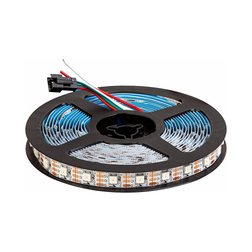 Светодиодная лента MAKSILED 12В, 60д/м, 9.6Вт/м, SPI-RGB, IP20, 5м, мульти ML-R60-5050RGB-INK1003-S открытая, с микросхемой управления. Предназначена для воплощения многоцветных световых эффектов - от простой функции «бегущий огонь» до создания ярких динамических эффектов. Важно, что лента на коротких участках - при нарезке до полуметра - может питаться от 5 В, а на более длинных - от 12 В. Это означает ее высокую универсальность и применимость в реализации множества идей. Управление лентой от внешнего контроллера с интерфейсом SPI (приобретается отдельно). Обязательна установка на профиль. Достаточно снять защитный слoй с ленты и приложить к предварительно обезжиренной поверхности. Обратная сторона ленты клеится на ровную поверхность, что позволяет украсить любую часть интерьера (стены, потолок, шкаф, фоновое освещение телевизора, кровать, диван, зеркало, лестница).