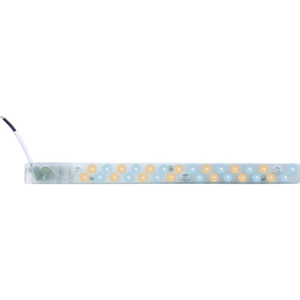 Светодиодный модуль со встроенным драйвером Apeyron предназначен для замены стандартных ламп, а также современных светодиодных источников свечения, которые уже повсеместно используются в настенно-потолочных светильниках. Благодаря конструкции этого модуля плафон светильника будет светиться на все 100%, а уровень освещенности повысится даже по сравнению со светодиодными лампами аналогичной мощности. Благодаря большей площади охлаждения срок службы будет в разы больше. У данного изделия световой поток равен 1260 лм, что является эквивалентом лампы накаливания мощностью 110 Вт. Является двухцветным.Каждый светодиод изделия имеет 2 базовых цвета: теплый белый с цветовой температурой 3000 К и холодный белый с цветовой температурой 6500 К. Переключение цвета свечения происходит с помощью бытового клавишного выключателя.Угол рассеивания изделия равен 170° благодаря линзам, установленным поверх светодиодов, что существенно увеличивает угол рассеивания и позволяет полностью осветить плафон светильника, делает освещение более качественным.Светодиодный модуль имеет прямоугольную форму с размером 400х32 мм и толщиной драйвера 26 мм. Данное изделие работает от напряжения 230 В и не требует дополнительных устройств для подключения. Благодаря отсутствию пульсации подходит для использования в жилых помещениях, а также административных, медицинских, производственных и образовательных учреждениях.Площадь освещения 6-8 м².