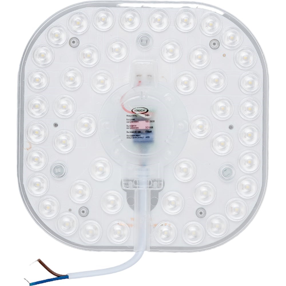 Светодиодный модуль IONICH для декоративных светильников 24 Вт 1920 Лм 230 В 6500 К 150x150 мм IP20 1206 со встроенным драйвером предназначен для замены стандартных ламп, а также современных светодиодных источников света, которые уже повсеместно используются в настенно-потолочных светильниках.Применяется для:Модернизации светильников с традиционными источниками света (лампа накаливания, КЛЛ);Замены вышедших из строя светодиодных плат в светильниках;В качестве самостоятельного источника освещения, без установки плафона/рассеивателя.
