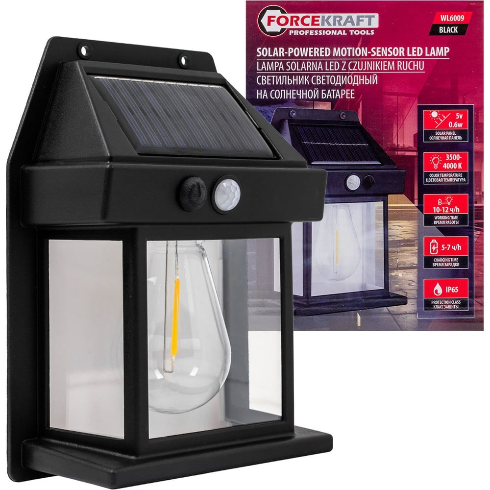 Светодиодный настенный фонарь на солнечной батарее от бренда Forcekraft — это универсальный беспроводной светильник, предназначенный для освещения дачи, сада, дома и улицы. Он обеспечивает качественное освещение во дворе, гараже или на природе благодаря теплому свету с температурой 3500-4000K.ХарактеристикиТип освещения: СветодиодныйИсточник питания: Солнечная батареяДатчики: Датчик движения и датчик светаРежимы работы:Включение при наступлении темноты и распознавание объектов в радиусе 3-5 метров.Непрерывная подсветка на малой мощности с ярким освещением при обнаружении движения.Постоянный свет на малой мощности.Батарея: 3.7V, 1200mAhСтепень защиты: IP65 (водо- и пыленепроницаемость)Экономия энергии: Использование солнечной энергии сокращает расходы на электроэнергию и является экологически чистым решением.Легкость установки: Установка занимает считанные секунды, саморезы входят в комплект, нет необходимости в кабелях.Долговечность: Изготовлен из качественных материалов, обеспечивающих долгий срок службы.Многофункциональность: Идеально подходит для дачи, сада, а также может использоваться в качестве туристического аксессуара для кемпинга, рыбалки и пикников.Декоративный дизайн: Стильный ретро-стиль фонаря станет украшением любого фасада.Светодиодный настенный фонарь на солнечной батарее — это удобное и эффективное решение для освещения территории в темное время суток.Важно помнить, что перед эксплуатацией фонарь необходимо полностью зарядить на солнце в течение 5-7 часов.
