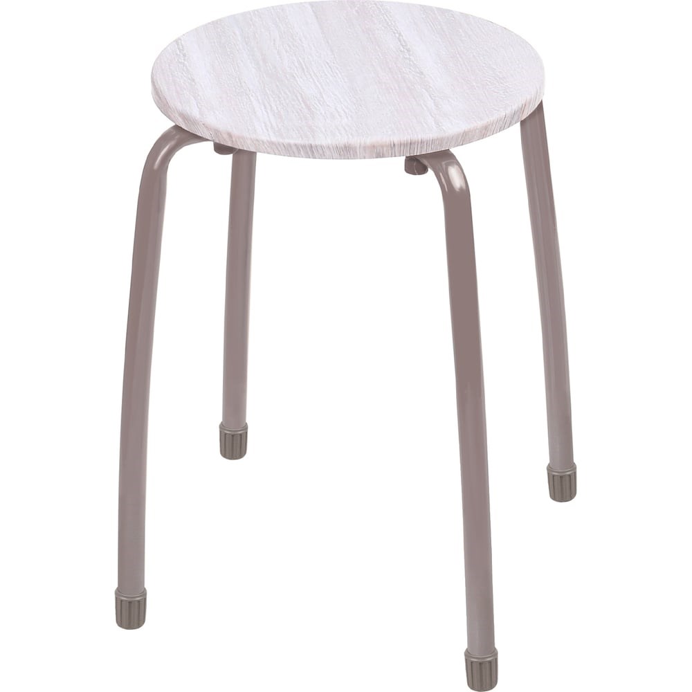 Табурет на четырех опорах с сиденьем из МДФ с древесным декором. Пластиковые колпачки на ножках защищают поверхность пола от царапин. Конструкция стула позволяет легко штабелировать несколько изделий.