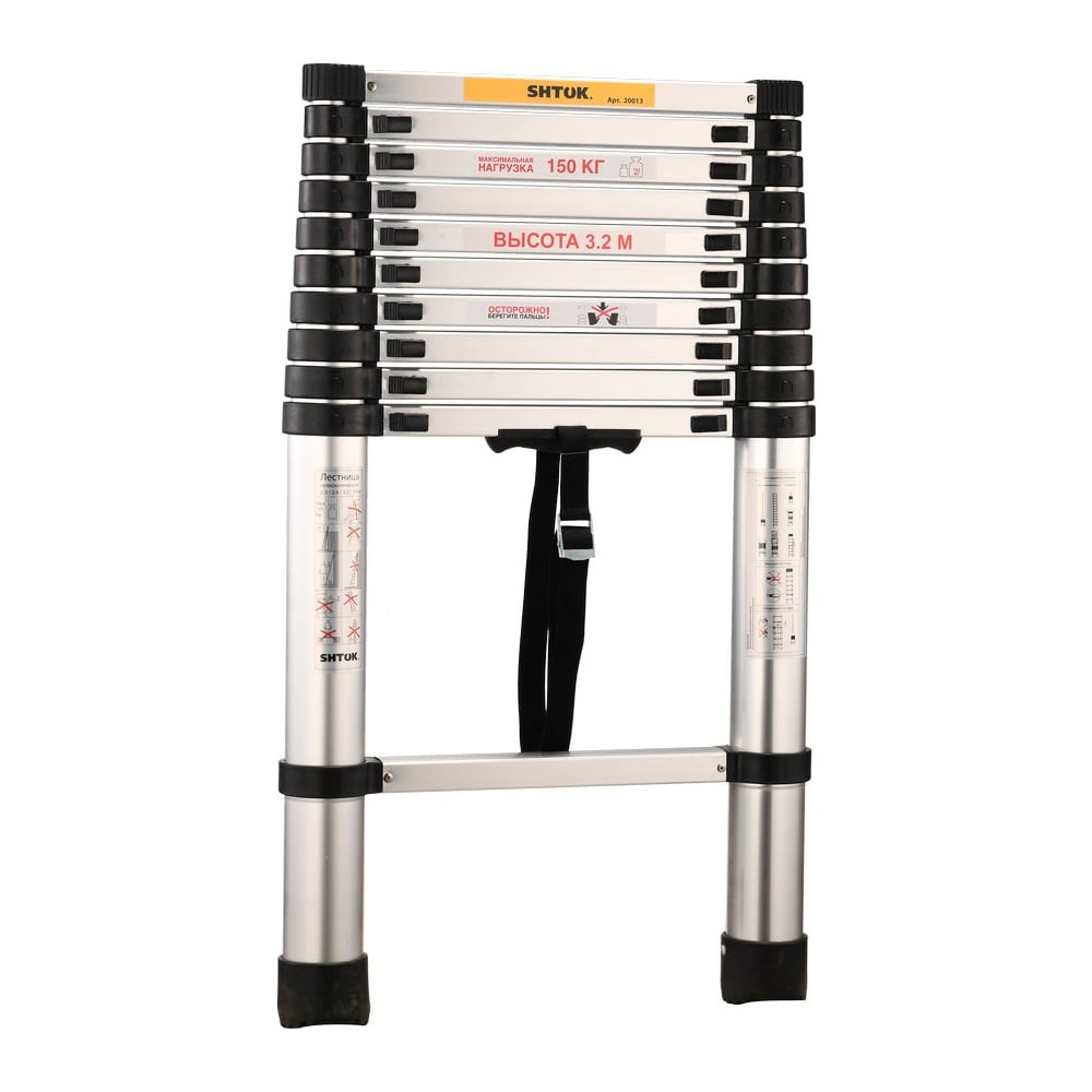 Телескопическая лестница SHTOK 3.2м 20013 выдерживает нагрузку до 150 кг за счет конструкции, выполненной из дюралюминия и первичного пластика. На стенде испытываемая лестница выдерживает 10 000 циклов на раскрытие-закрытие.