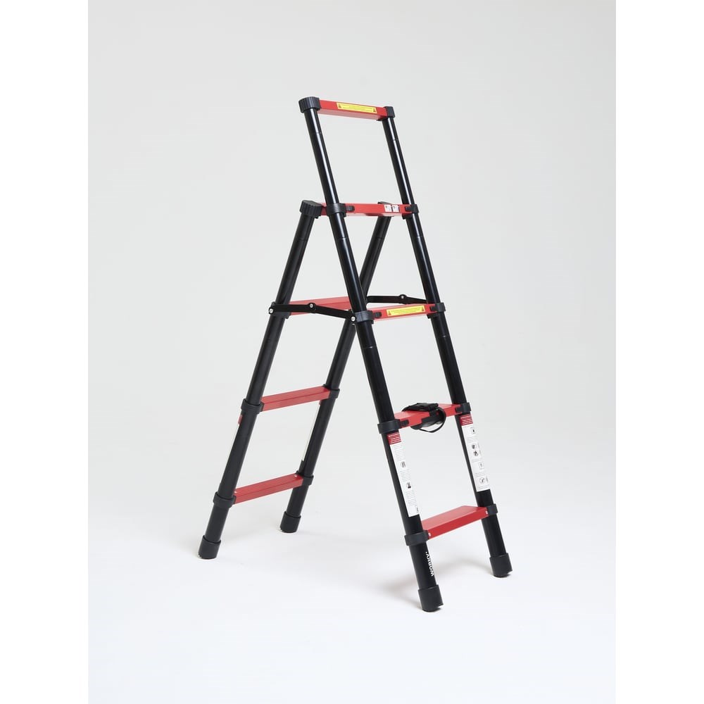 Телескопическая лестница-стремянка WORKY BLACK 4+5 ступеней, 1.1м+1.4м ARD257794входит в премиум сегмент лестниц благодаря повышенной надёжности и качественному крашенному покрытию, которое бережёт лестницу от износа, не оставляет алюминиевого следа на руках и придаёт современный стильный вид вашей лестнице. Противоскользящие опорные башмаки из резинопластика, которые защищают напольные покрытия, обеспечивают крепкое сцепление с любой поверхностью. Она легко транспортируется, так как без проблем помещается даже в небольшой автомобиль. Лестница без усилий раскладывается и мало весит. Имеет рифленые ступени, которые гарантируют надёжное сцепление стопы с поверхностью. Ступеньки в рабочем положении фиксируются автоматически. Система блокировки предохраняет от непроизвольного складывания лестницы, разблокировка осуществляется нажатием кнопок на ступенях.