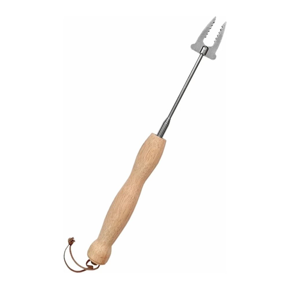 Выдвижная вилка-шампур для барбекю изготовлена из высококачественной нержавеющей стали. Деревянная крепкая рукоять имеет эргономичною форму, благодаря которой её удобно держать в руке, а непроводящий тепло материал защитит руки от ожога. Телескопический стержень имеет 6 выдвижных секций и регулируется по длине до 55 см, что позволяет держать руку на безопасном расстоянии от огня. Зубцы вилки имеют зазубрины, которые позволяют прочно удерживать пищу на вилке и не упасть ей в огонь. После использования вы можете сложить вилку. При складывании вилка полностью убирается в рукоять, также на рукояти имеется темляк для подвешивания, что обеспечивает удобное хранение. Вилка идеально подходит для жарки мяса, колбасок, овощей, маршмэллоу и других продуктов на костре, мангале или барбекю.