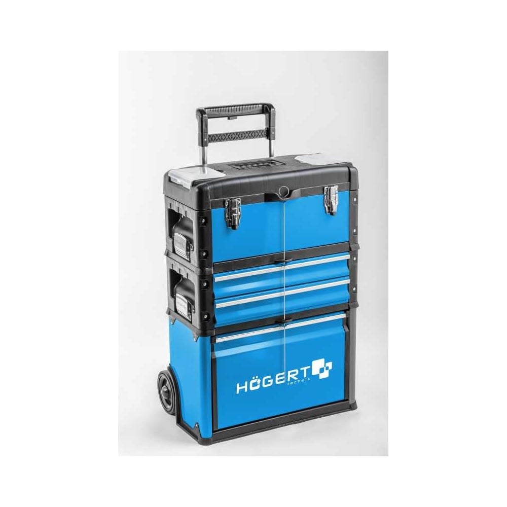 Тележка для инструментов HOEGERT HT7G080 (3 модуля)Мобильная и многофункциональная инструментальная тележка HOEGERT, состоящая из 3-х модулей, обеспечивающая удобное хранение и транспортировку до 45 кг инструментов.Описание:Инструментальная тележка HOEGERT HT7G080 представляет собой 3-сегментный модульный сервисный шкаф, идеально подходящий для профессионалов, ценящих мобильность, безопасность и гибкость. Три независимых модуля (с ящиком, выдвижными ящиками и просторным отсеком для хранения) позволяют упорядоченно хранить инструменты. Компактные размеры, встроенные колеса и телескопическая складная ручка обеспечивают удобную транспортировку на автомобиле и доставку практически на любое рабочее место. Идеальное решение для компаний, предоставляющих услуги по техническому обслуживанию, авторемонтных мастерских, а также для домашней мастерской.Преимущества:Модульная конструкция: 3 независимых модуля для гибкой организации хранения.Мобильность: Встроенные колеса и складная телескопическая ручка для удобной транспортировки.Вместительность: Общая грузоподъемность до 45 кг.Прочность: Прочная металлическая конструкция с пластиковыми бортами.Безопасность: Металлические боковые застежки для надежной фиксации модулей.Удобство: Компактные размеры и небольшой вес.Нижний отсек: Большой откидной ящик размером 410 x 210 x 280 мм и грузоподъемностью 15 кг с колесами, телескопической ручкой и дополнительной ручкой для переноски.Применение:Авторемонтные мастерскиеСервисные центрыТехническое обслуживаниеДомашние мастерскиеТранспортировка инструментов