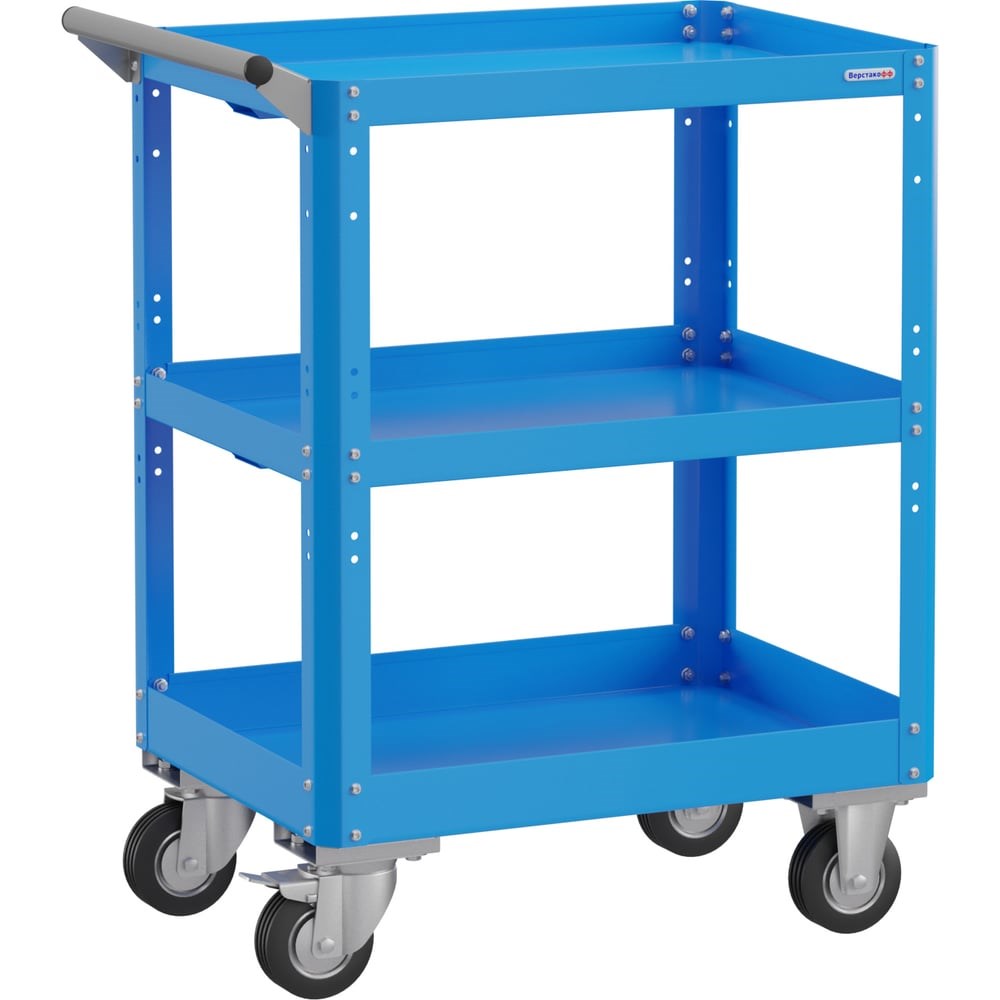 Тележка Верстакофф PLC 8006.0 133118 открытого типа, предназначена для хранения и перемещения различных предметов, вещей, инструментов.Общий вес изделия 15кг.Равномерно распределённая нагрузка: полка нижняя до 40кг., полка средняя до 25кг., полка верхняя до 20кг.Общая равномерно-распределённая нагрузка на тележку - до 100кг. Корпус тележки выполнен из листовой стали толщиной от 0,6 до 1,5мм., покрыт полимерной порошковой краской. Верхняя и средняя полка имеют высоту борта 40мм., нижняя полка имеет высоту борта 60мм