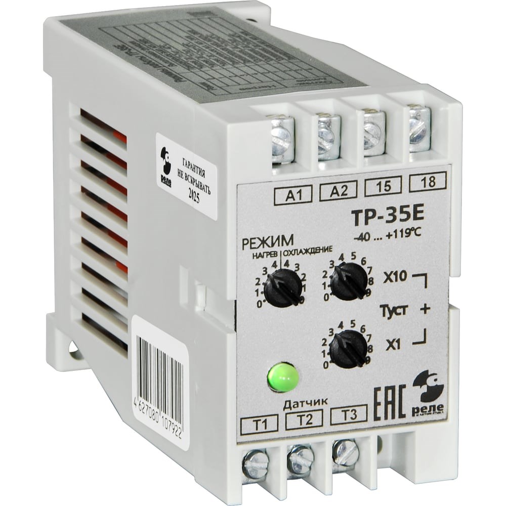 Температурное реле ТР-35Е производства Реле и Автоматика (артикул A8223-80107922), от -40 до +119C, 220В, 50Гц предназначено для применения в устройствах температурного контроля неагрессивной среды.На лицевой панели находятся переключатели установки температуры срабатывания термореле и индикатор включения (светодиод), который зажигается оранжевым цветом при срабатывании исполнительного реле. Если исполнительное реле находится в выключенном состоянии, при подаче напряжения питания светодиод светится зеленым цветом. При отказе датчика либо обрыве кабеля светодиод мигает красным.Особенности:Универсальное реле, может работать как в режиме "нагрев", так ив режиме "охлаждение"Диапазон контролируемых температур: -40...+119 ℃напряжение питания: 220В 50ГцТермодатчик ДТ (арт. A8223-34129184) или датчик М22 (арт. A8223-77946671) приобретается отдельно.