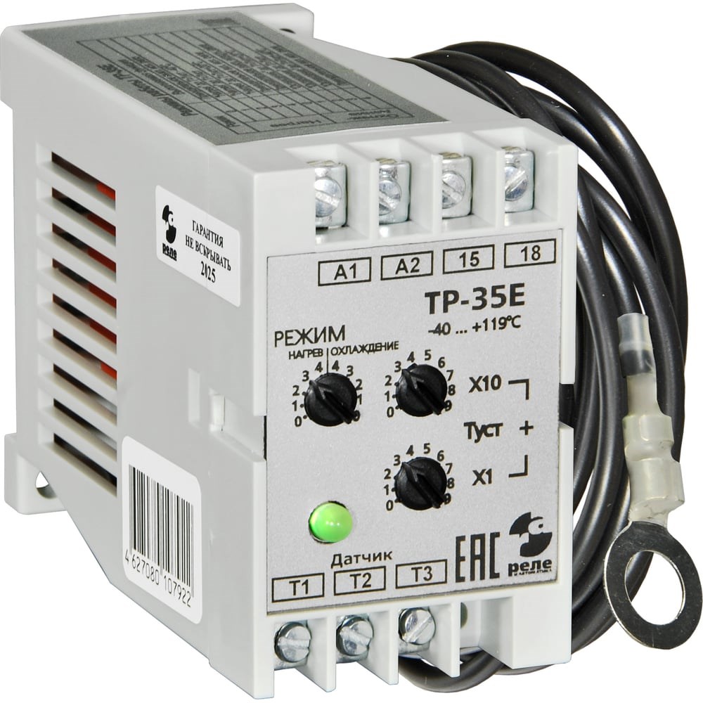 Температурное реле производства Реле и Автоматика ТР-35Е с датчиком ДТ, кабель 2,5м (артикул A8223-79683221) предназначено для применения в устройствах температурного контроля неагрессивной среды. На лицевой панели находятся переключатели установки температуры срабатывания термореле и индикатор включения (светодиод), который зажигается оранжевым цветом при срабатывании исполнительного реле. Если исполнительное реле находится в выключенном состоянии, при подаче напряжения питания светодиод светится зеленым цветом. При отказе датчика либо обрыве кабеля светодиод мигает красным.