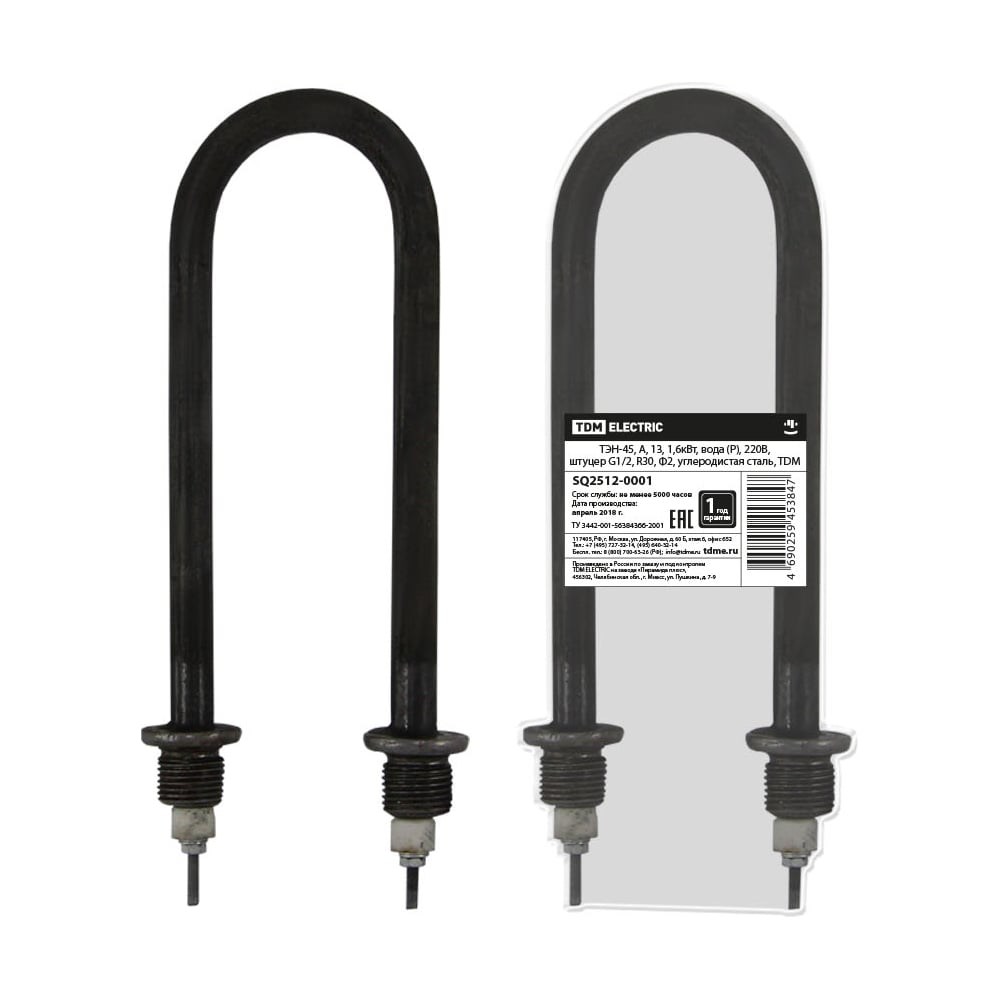 ТЭН TDM ELECTRIC 45, А, 13, 1.6 кВт, вода (Р), 220В, штуцер G1/2, R30, Ф2, углеродистая сталь SQ2512-0001 применяется в водонагревателях, кипятильниках, котлах отопления, умывальниках, самодельных ёмкостях для нагрева воды и прочих нагревательных устройствах. Изделие легко заменяется. Срок службы более 5000 часов. Заделка контактного стержня (А) - 40 мм Радиус гиба - 30 мм Крепежная арматура - штуцер 1/2" Диаметр оболочки - 13 мм Нагревательная среда - вода, слабый раствор щелочей (pH от 5 до 7) Габариты без упаковки: 240х116х30 мм