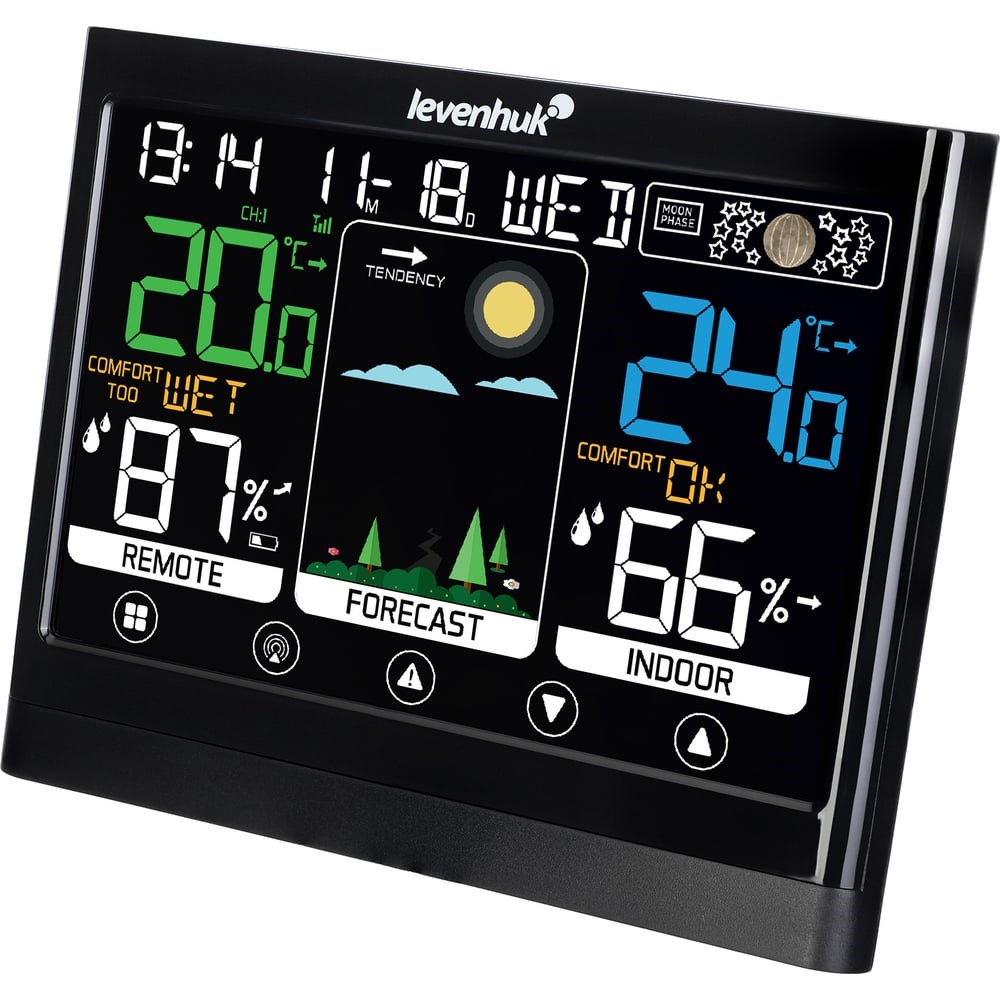 Термогигрометр Levenhuk Wezzer Teo TH50 предназначен для контроля над ключевыми показателями погоды и микроклимата: влажностью и температурой воздуха. Чрезмерно низкие или, наоборот, высокие значения могут оказывать негативное влияние на здоровье человека и даже вызывать обострения хронических заболеваний. К тому же, чтобы не подхватить сезонную простуду, лучше всегда одеваться по погоде. Этот прибор прекрасно подходит для решения таких задач. Термогигрометр проводит измерения сразу в двух местах: внешний датчик можно разместить на удалении до 80 метров от основного модуля. Показания самого термогигрометра отображаются в правой части экрана, датчика – в левой. Здесь же приводятся оценки уровня общего комфорта, по которым легко определить, все ли благоприятно. Центральный блок экрана посвящен прогнозу погоды и погодным трендам – здесь наглядно показывается, ожидать ли дождь или, наоборот, солнечную погоду. Верхняя часть экрана отведена под часы, календарь и будильник. Здесь же отображаются фазы Луны. Нижняя часть экрана – это сенсорные кнопки управления. И датчик, и основной блок можно ставить на стол или полку или крепить на стену на саморез. Питание термогигрометра – батарейки или сеть переменного тока, датчика – только батарейки. Для внешних датчиков рекомендуется использовать щелочные батарейки.